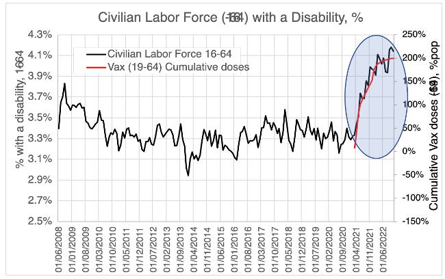 Enormous Amplitude – The long-term US disability baseline is about 3.3% of the workforce from 2010 to 2021. Mass mRNA “Vaccination” started in 2021 with subsequent steep increases in disabilities. Disabilities reached 4.15% by the beginning of 2022 – an unprecedented increase of 26% in a year. The jagged black line on the graph below shows the unprecedentedly steep increase in disabilities starting February 2021 when mass “Vaccination” of the workforce started. The vertical axis at the left shows the % of the labor force with a disability.