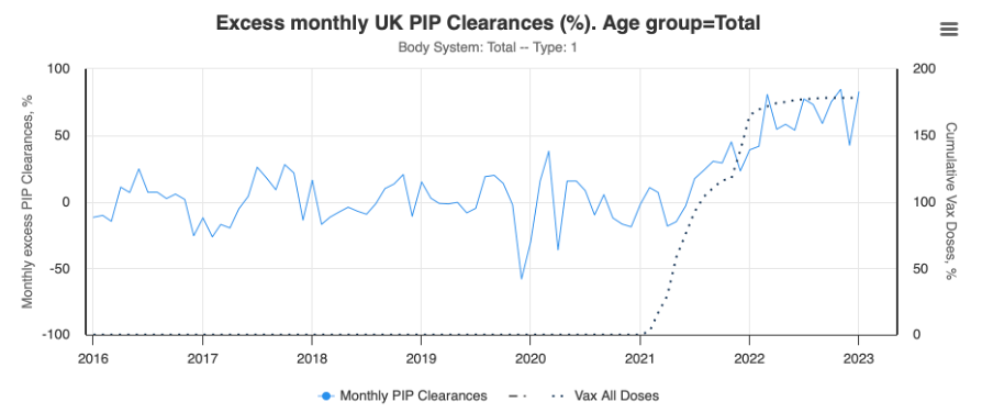 Enormous Amplitude – After mass “Vaccination” started in 2021, the disability % increased by 80% from the long-term baseline of from 2016 to 2019. The light blue line on the graph below shows the unprecedentedly steep increase in disabilities starting March 2021 soon after mass “Vaccination” started. The vertical axis at the left shows Monthly Excess PIP Clearances % above trend. PIP Clearances are processed disability claims.